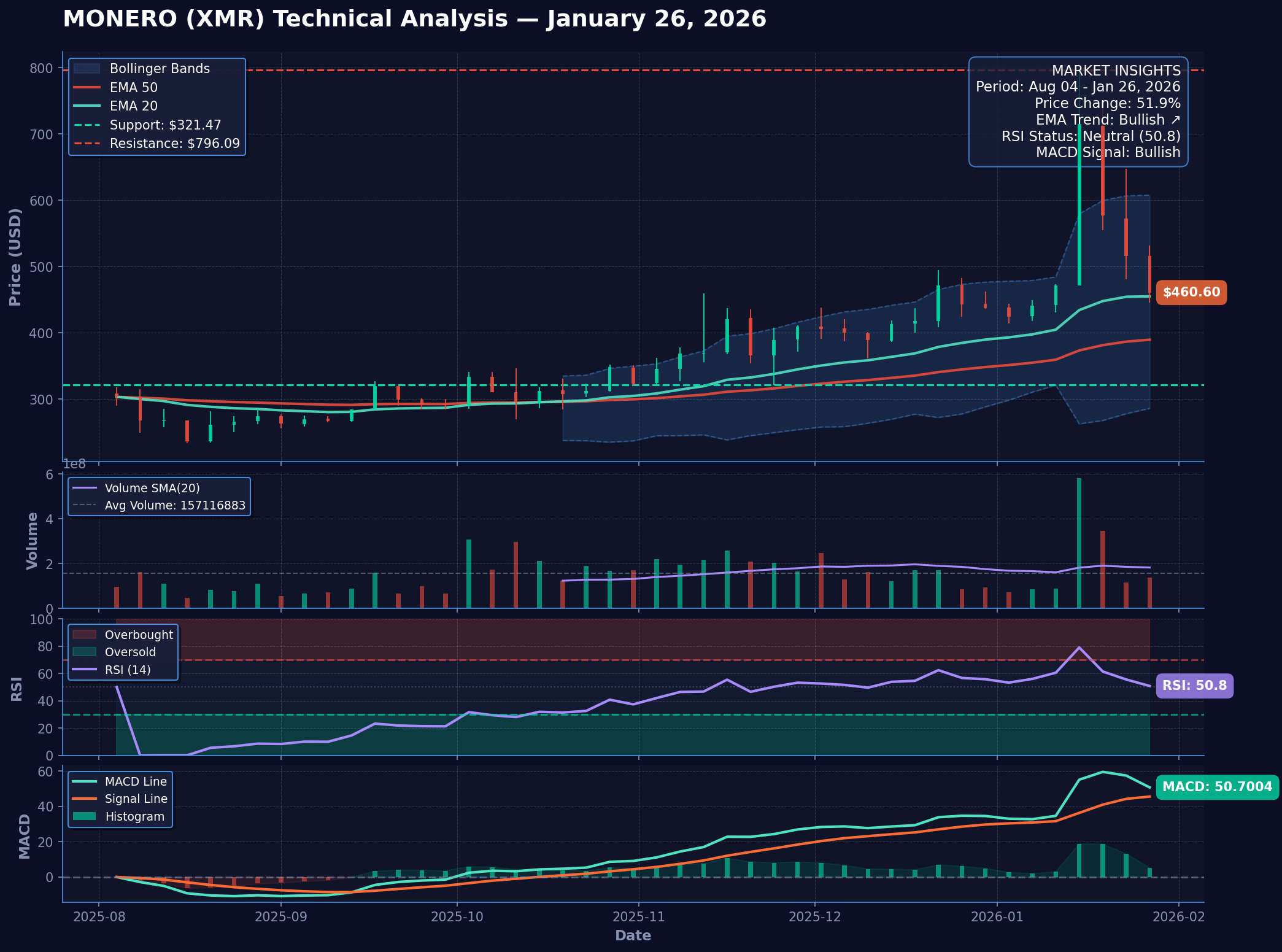 Momentum: bullish. Short-term trend: uptrend. As long as XMR stays above 321.47, setup favors bulls. A close below 315.04 would weaken the setup.
