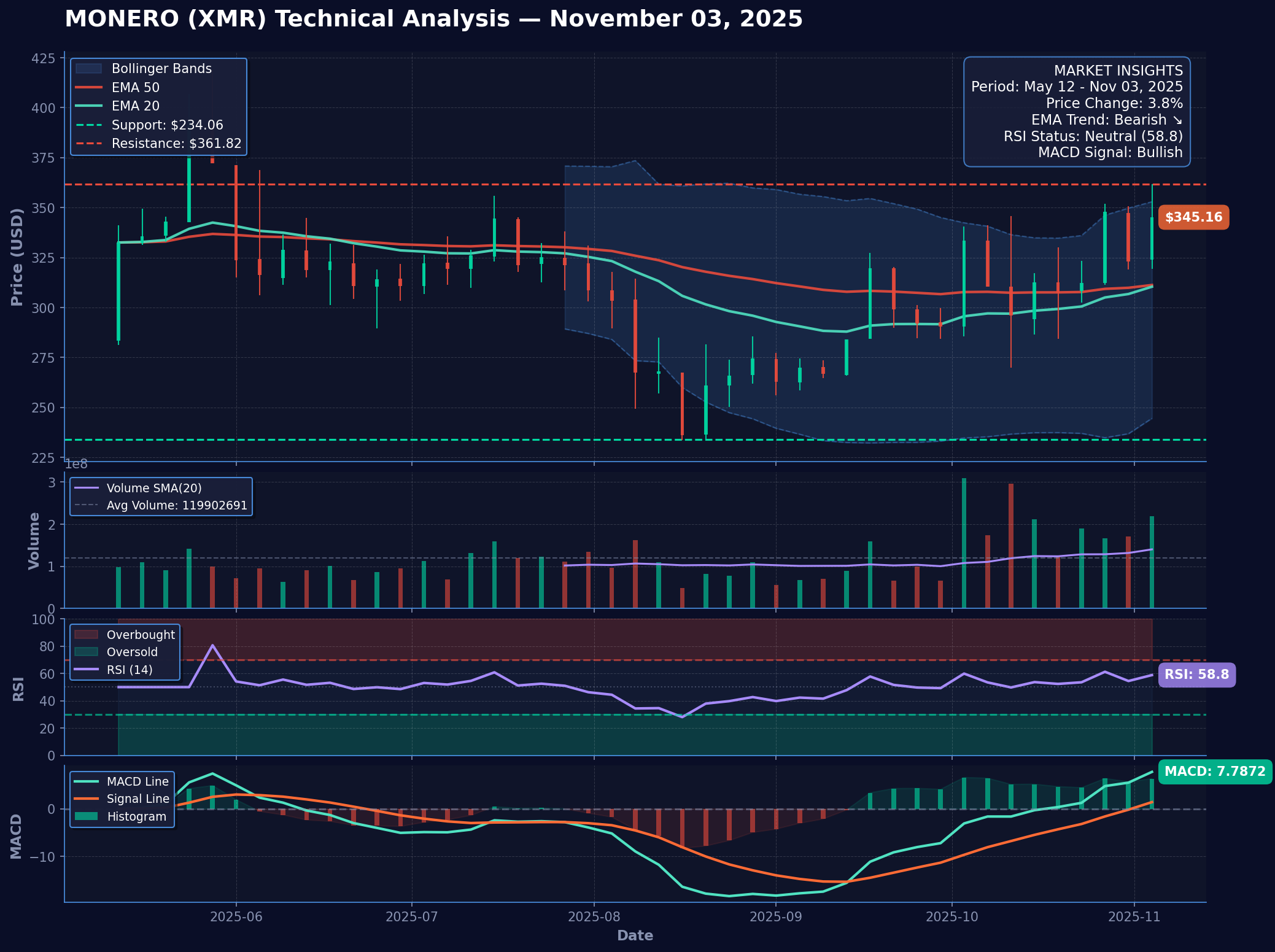 Momentum: bullish. Short-term trend: downtrend. As long as XMR stays above 234.06, setup favors bulls. A close below 229.38 would weaken the setup.